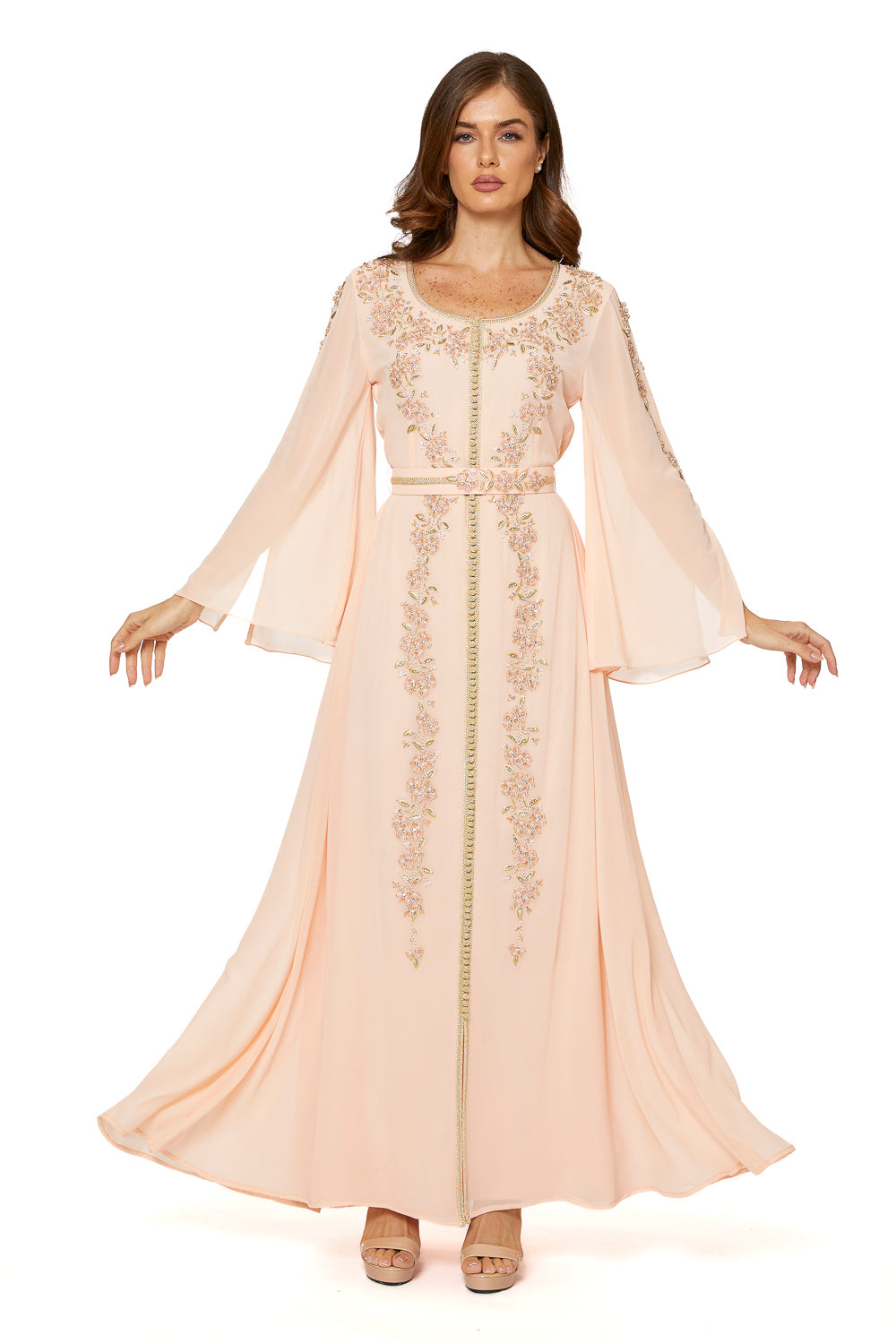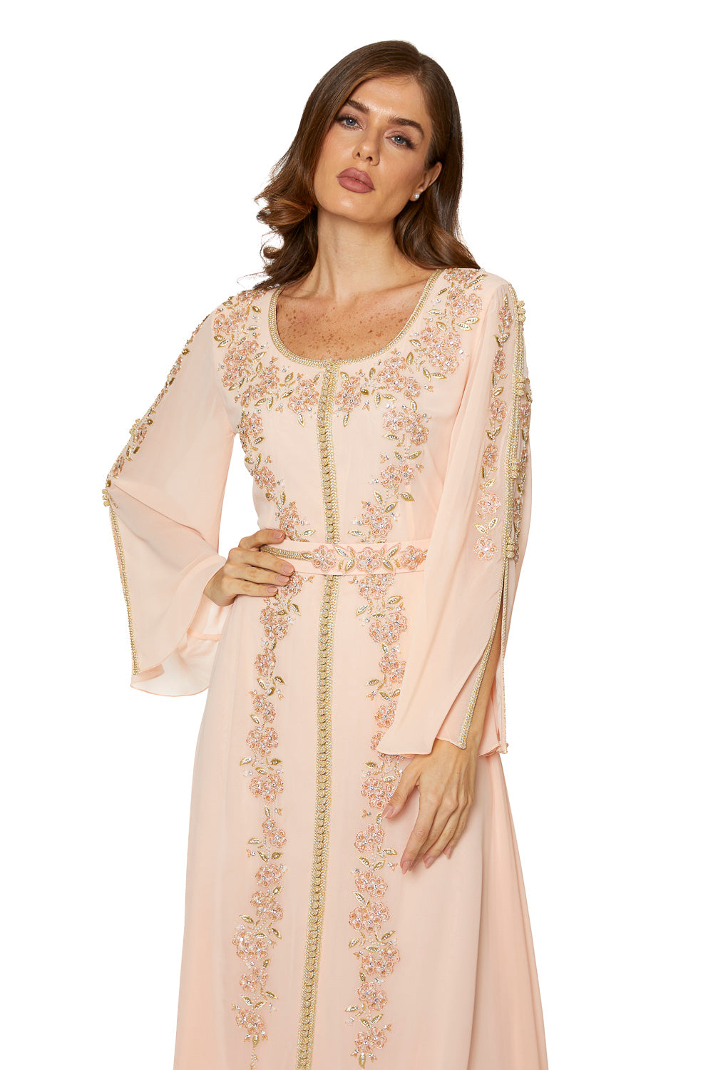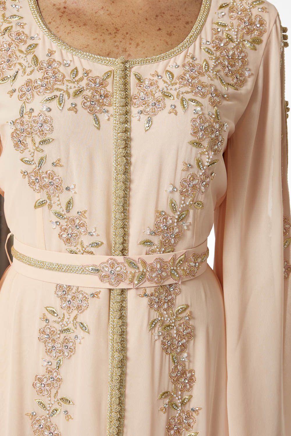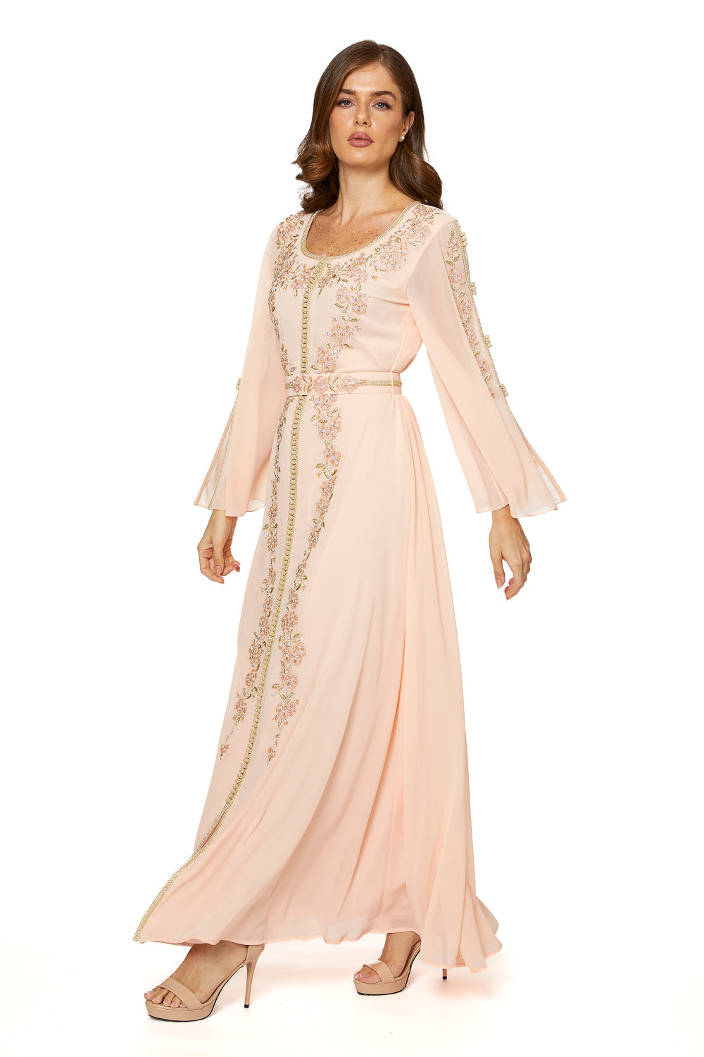 Elevate your special occasions with the Moroccan Caftan ELMM 599, a refined blend of tradition and craftsmanship. This luxurious garment showcases intricate hand and machine embroidery, creating a distinctive design that highlights expert artistry. Its elegant silhouette and detailed embellishments ensure a striking presence for any formal event. Designed to honor heritage while offering contemporary sophistication, this caftan is an impeccable choice for those who appreciate exceptional quality and timeless style.
