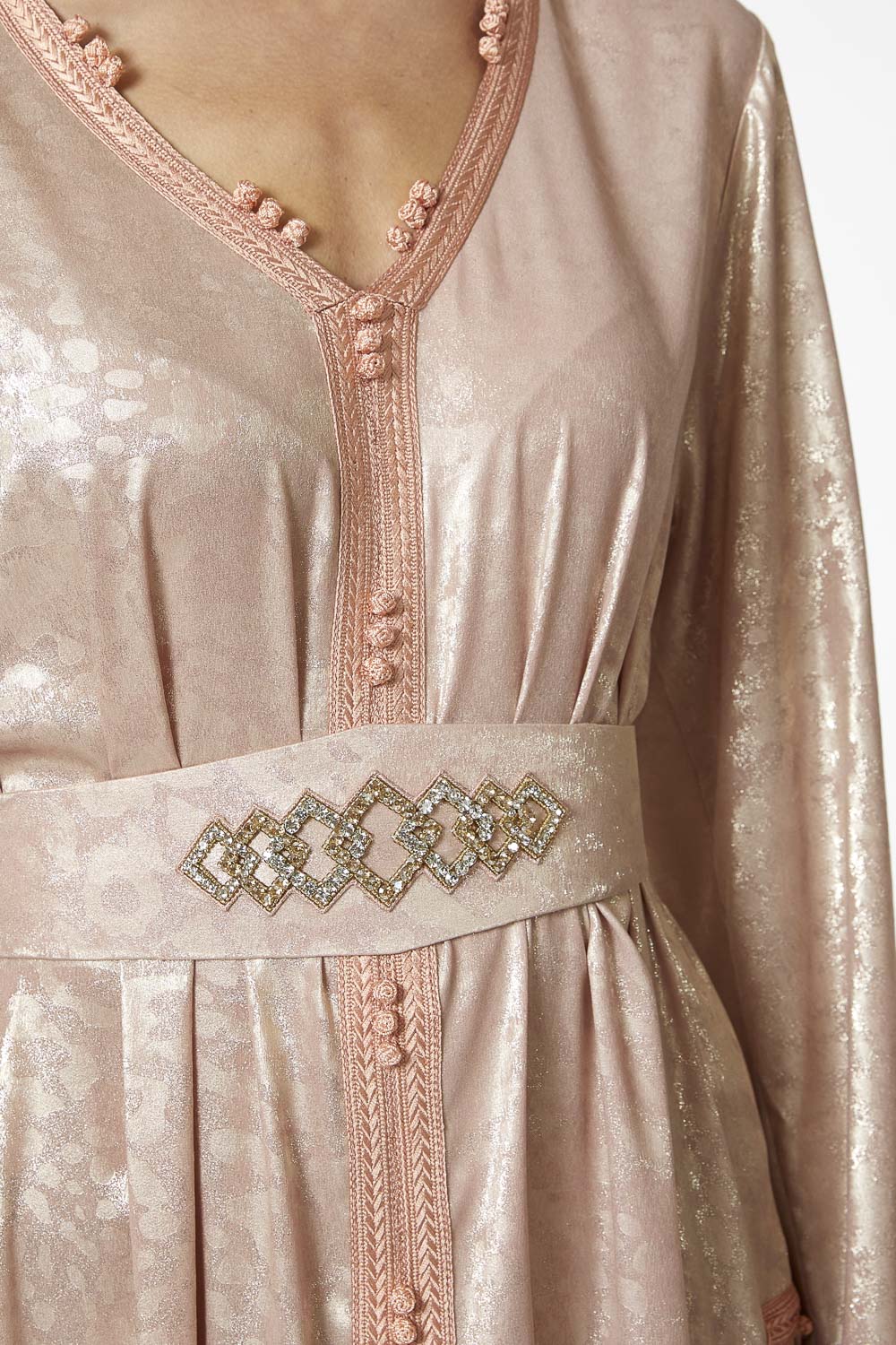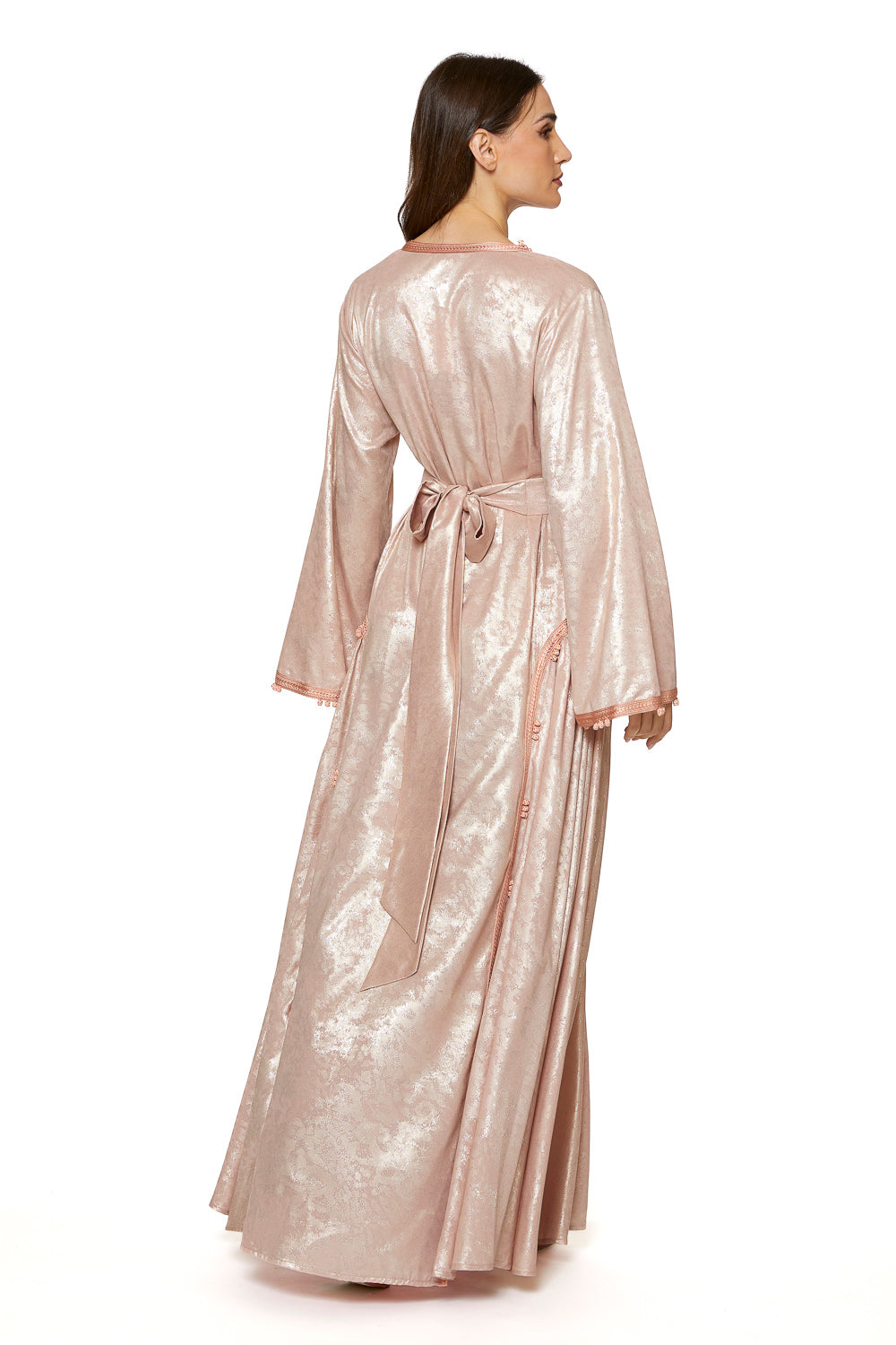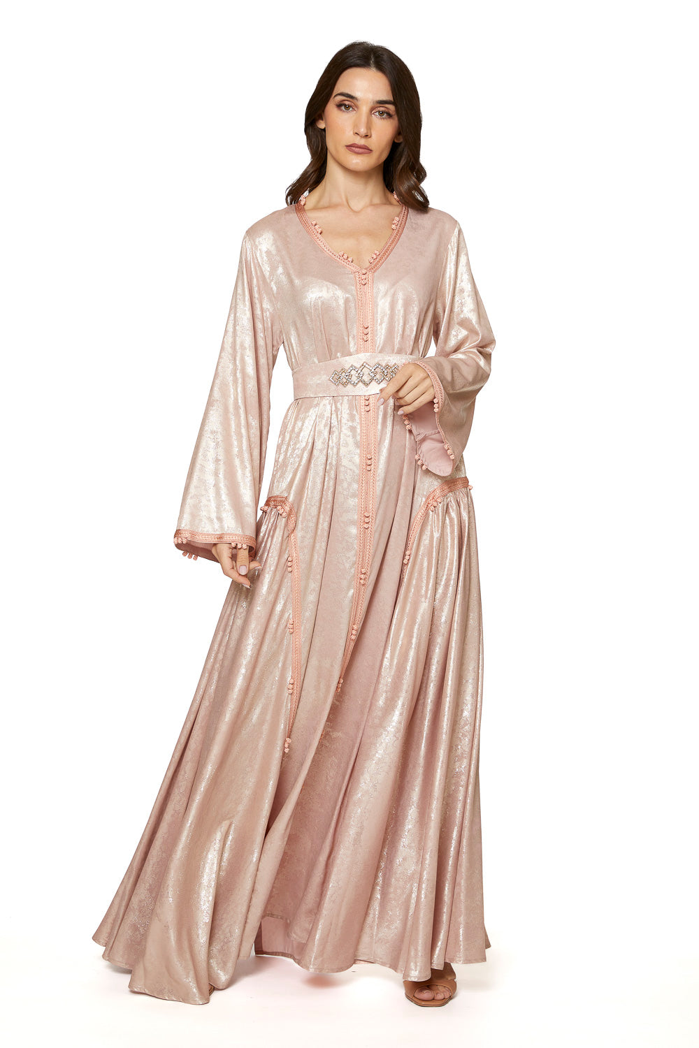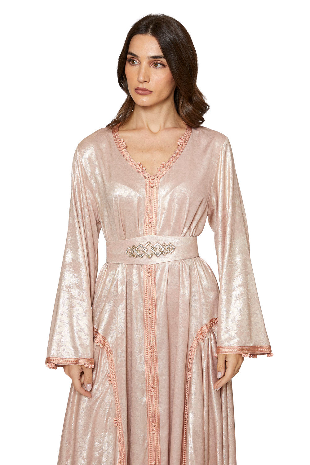 A Moroccan kaftan made of luxurious silk crepe, richly decorated with elegant Moroccan silk trim and a sophisticated belt hand-embroidered with crystals