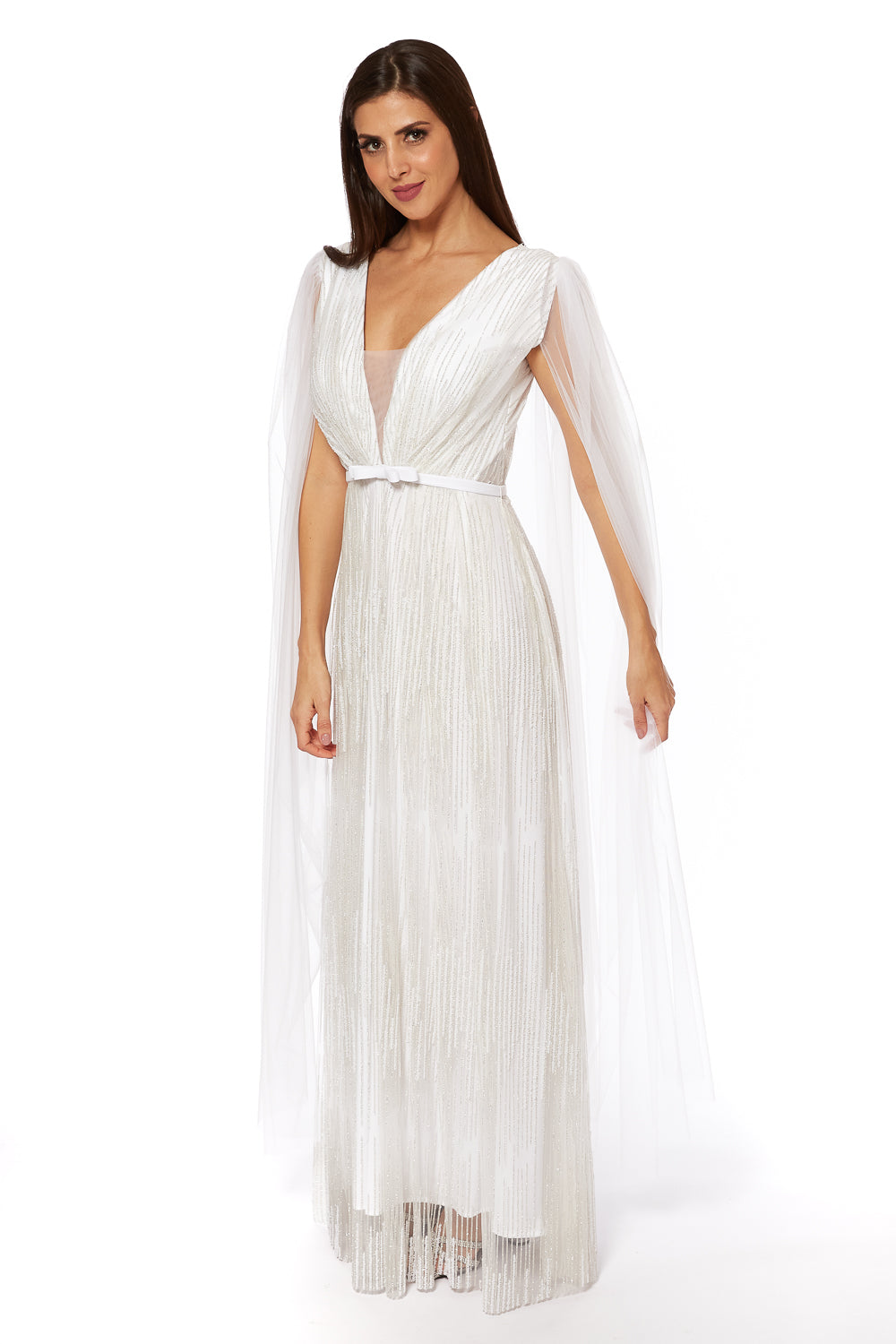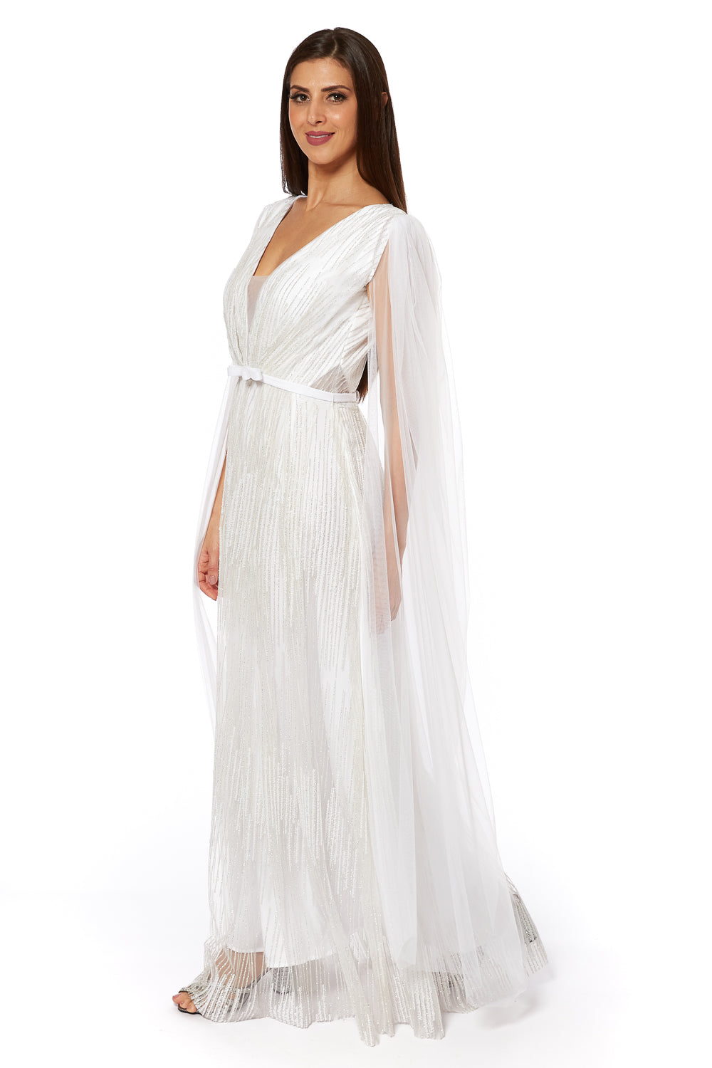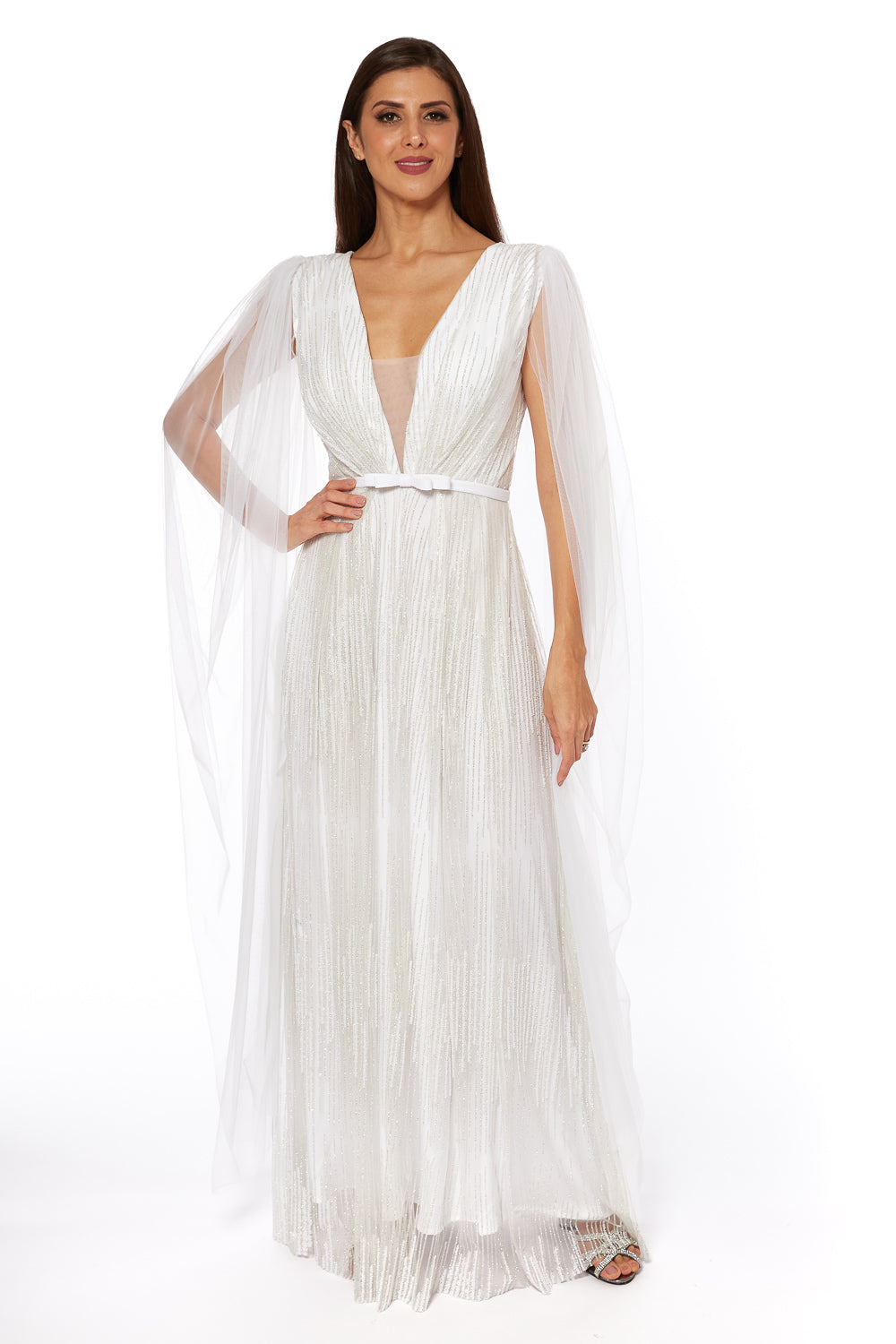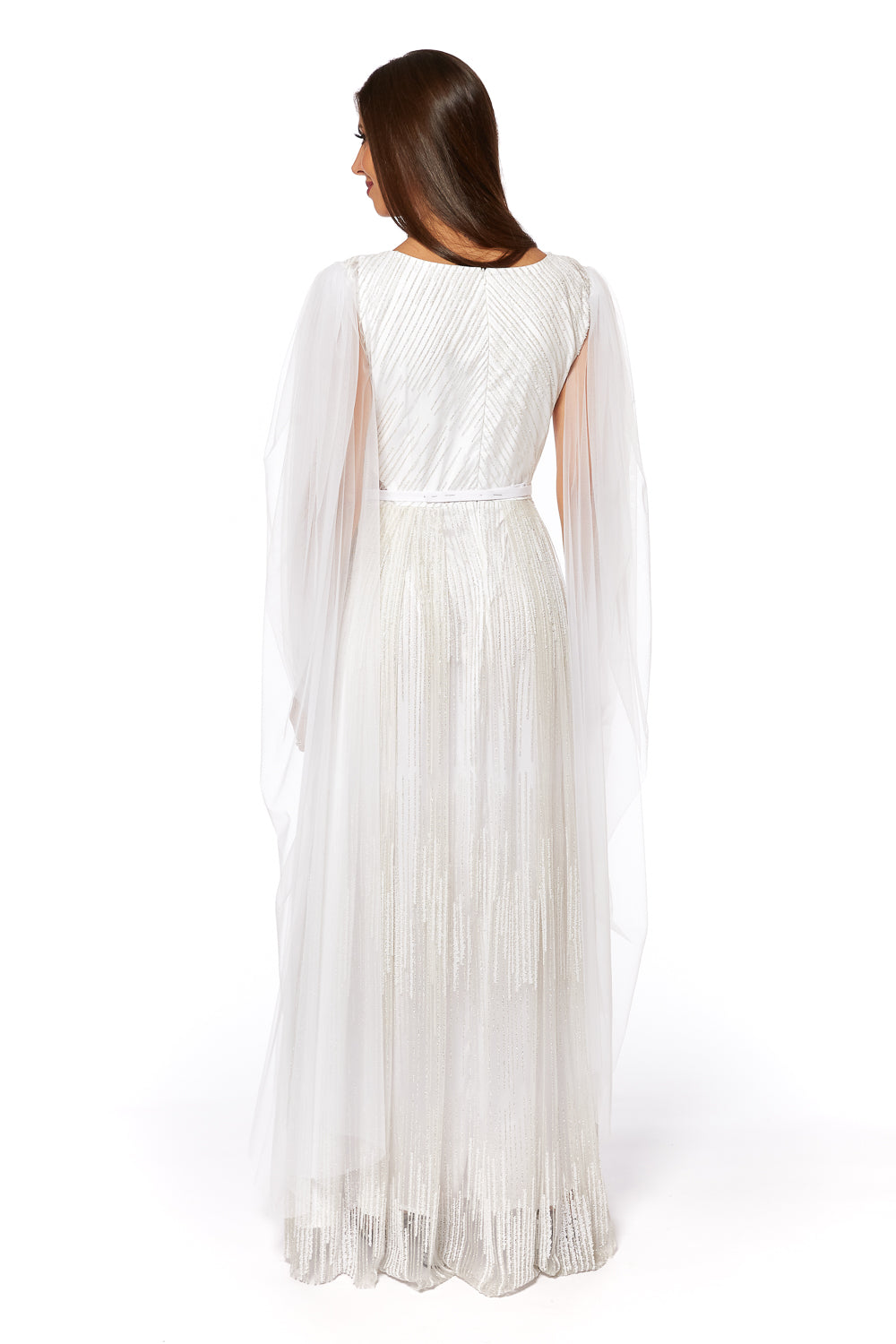 This elegant evening dress combines luxurious silk crepe lining with a self-beaded tulle overlay, delicately embroidered with sparkles and pearls. Its V neckline and cape-style long sleeves create a refined silhouette, while the waist-waisted A-line cut enhances the figure beautifully. The concealed back zip ensures a seamless finish. Designed for sophistication, this dress requires dry cleaning to maintain its exquisite detail and fabric quality.