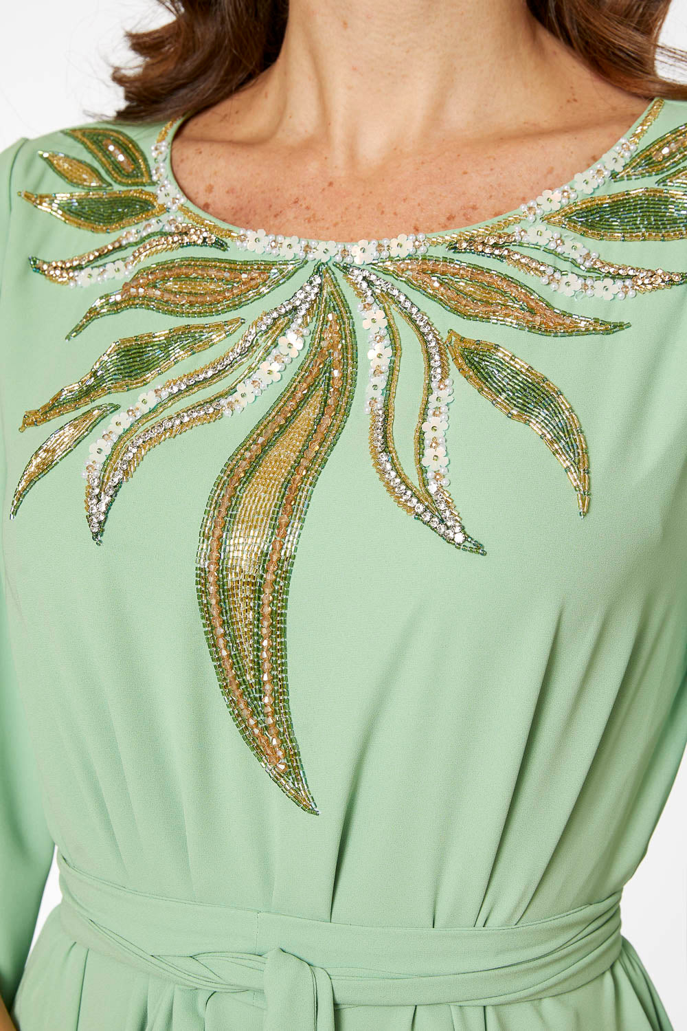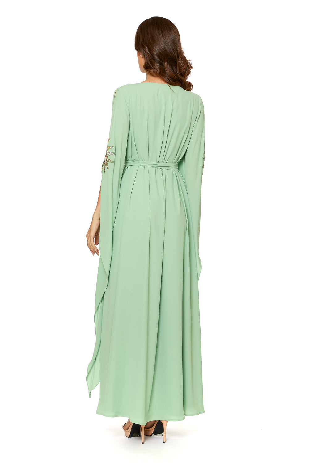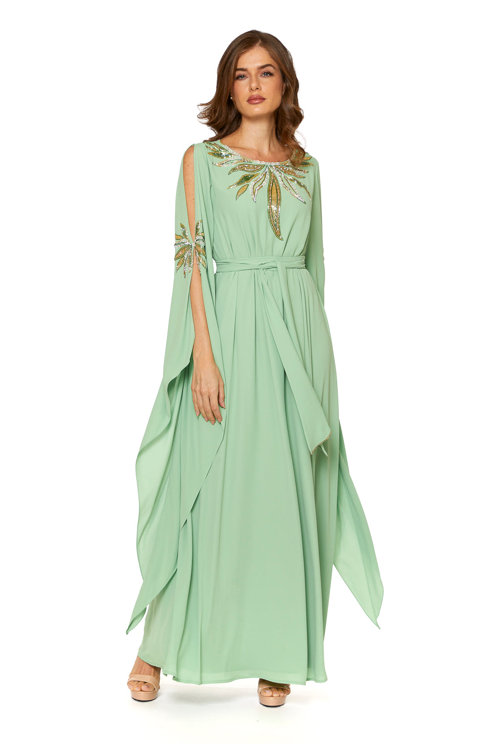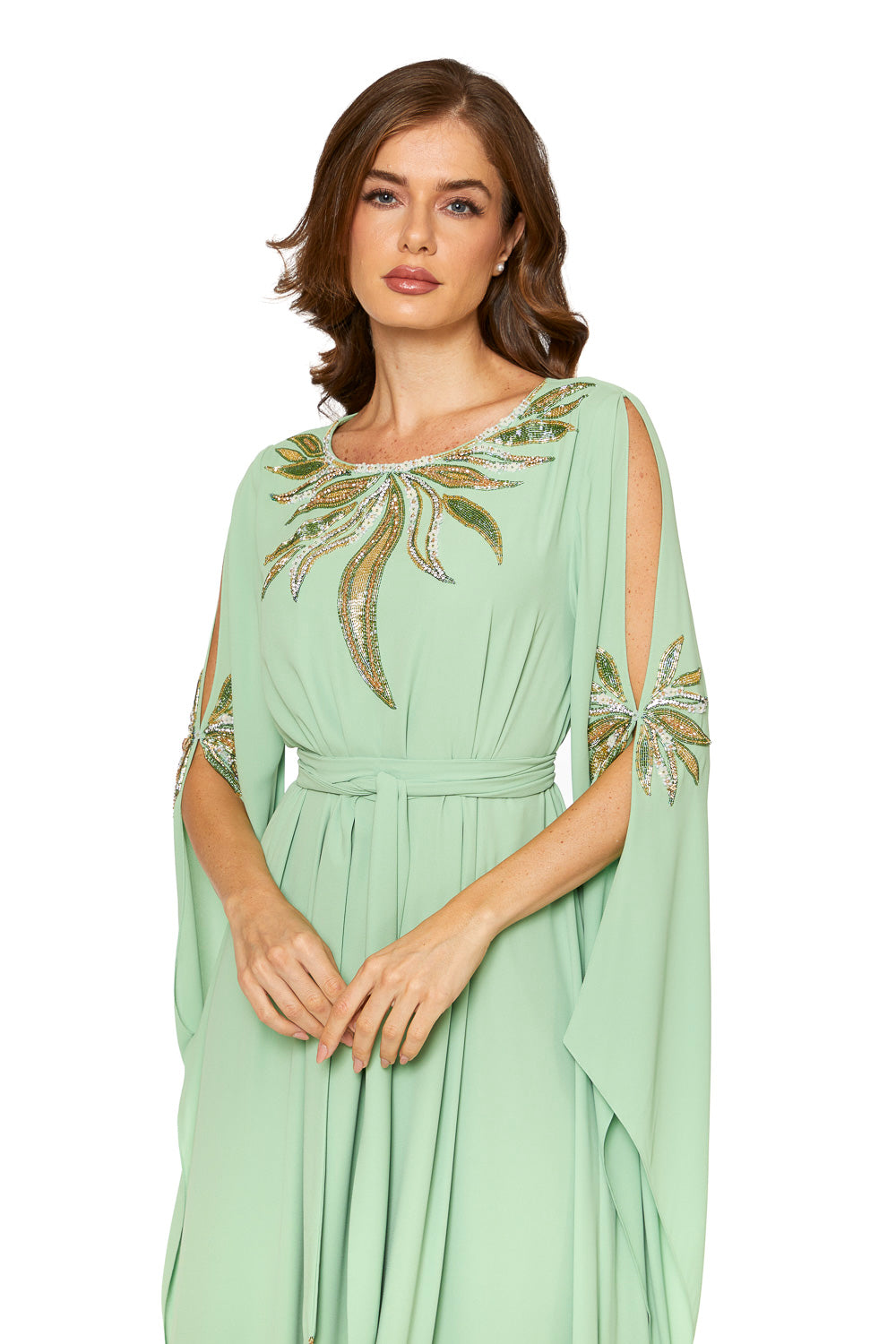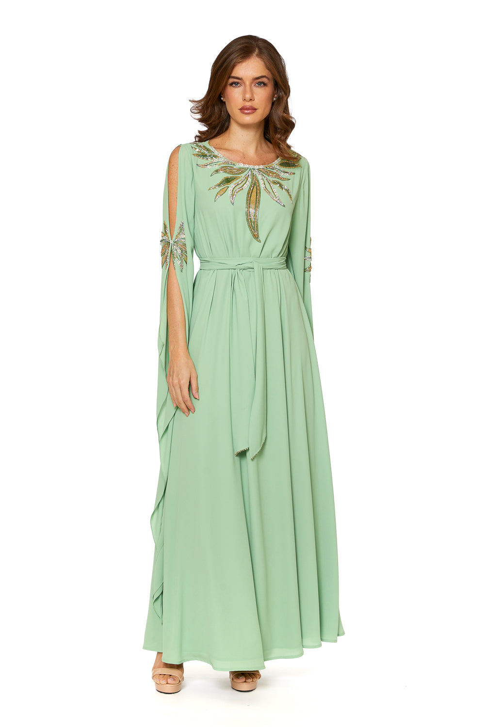 An elegant jalabiya made from soft crepe, hand-embroidered with crystals, sequins, and beads, giving you a luxurious look. The hand embroidery on the chest and sleeves adds a touch of elegance to your outfit. • An ideal choice for parties and special occasions