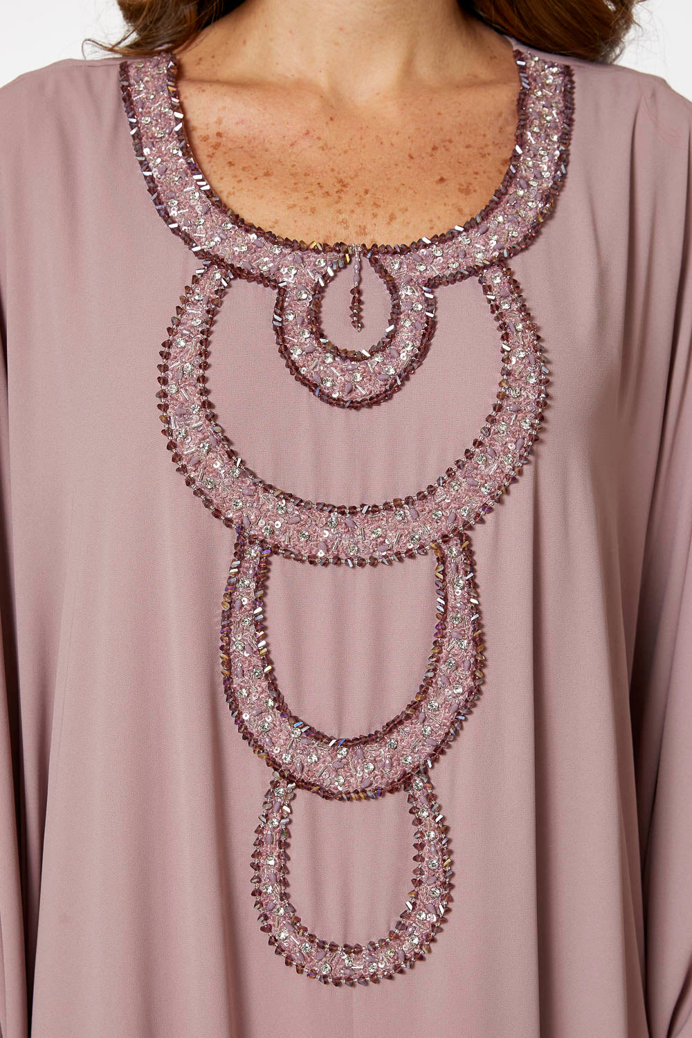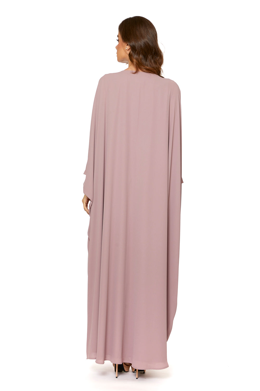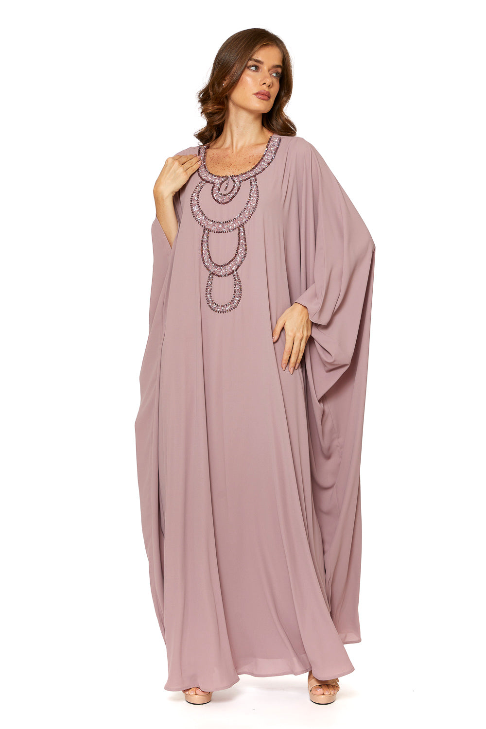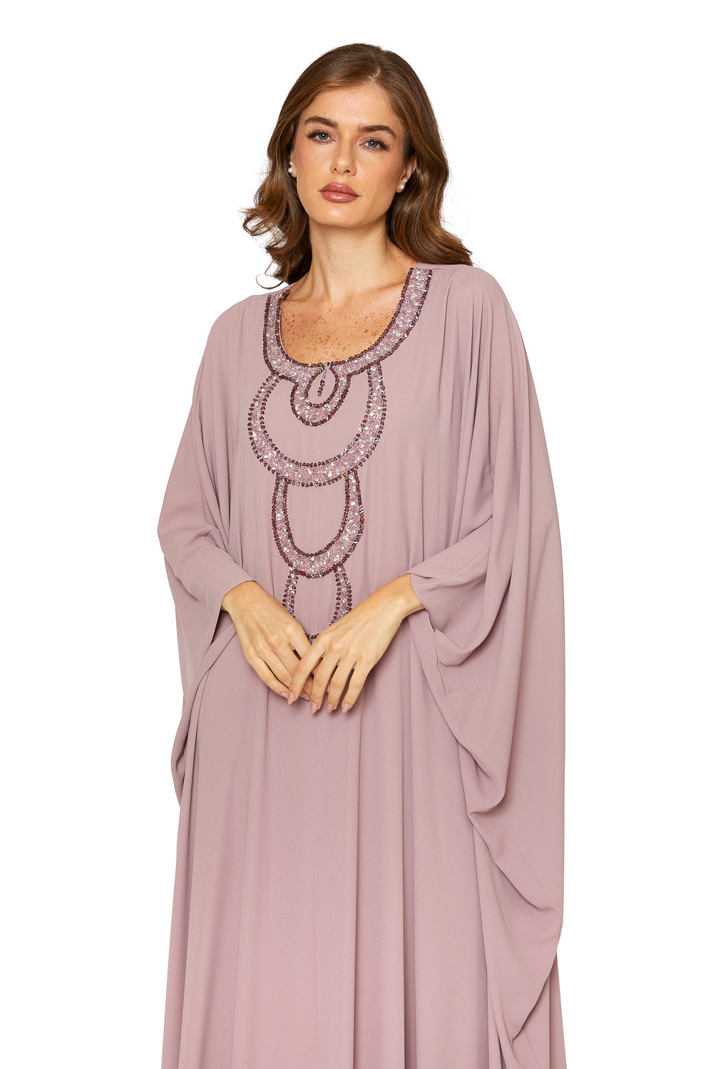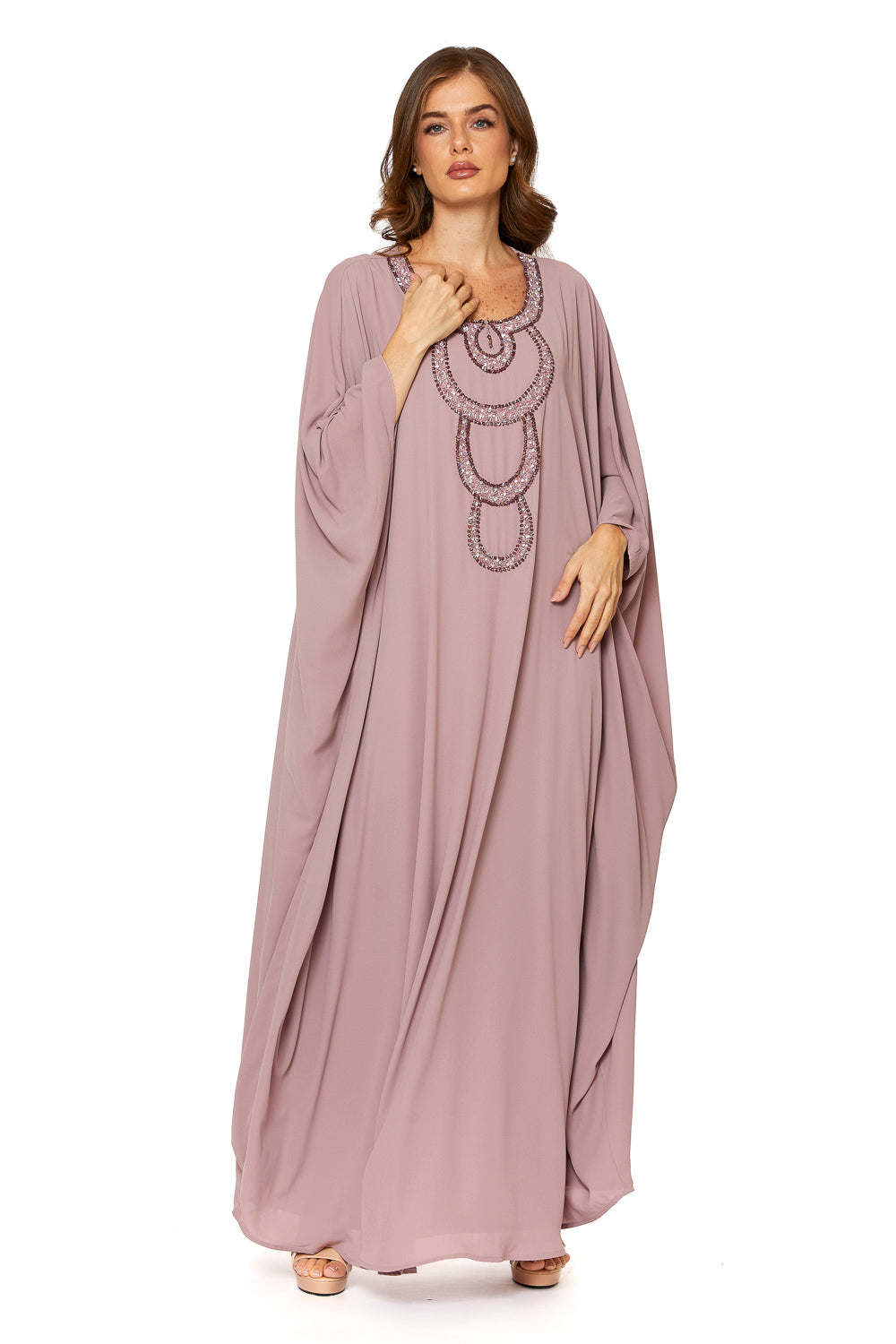 An elegant jalabiya made of soft crepe, hand-embroidered with crystals, sequins, and beads, giving you a luxurious look. The hand embroidery on the chest adds a touch of elegance to the outfit