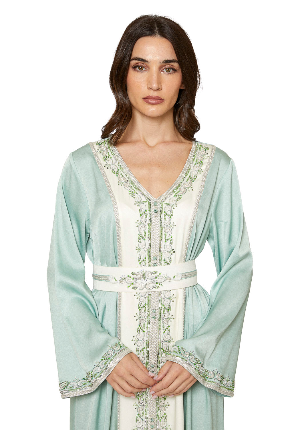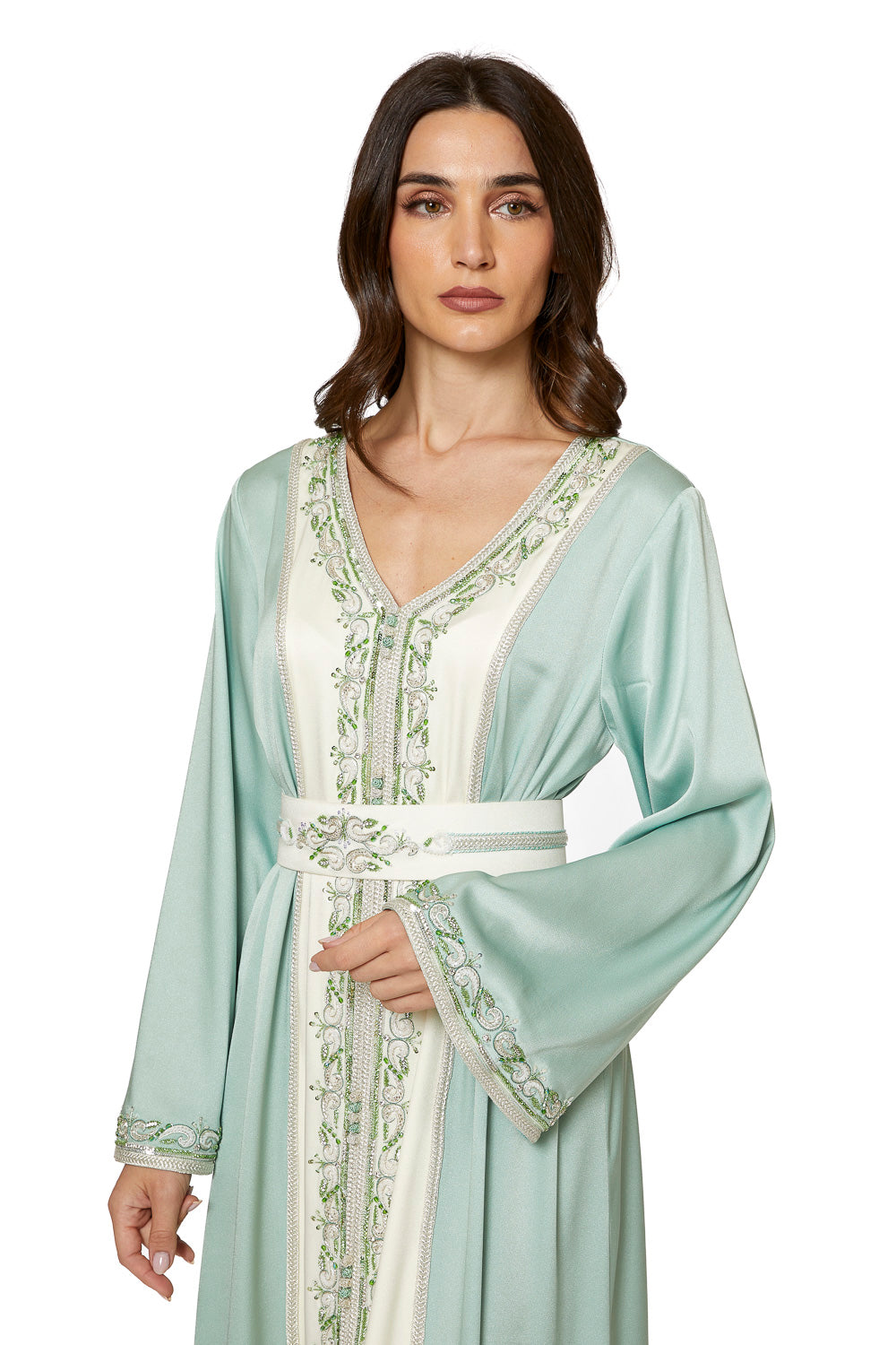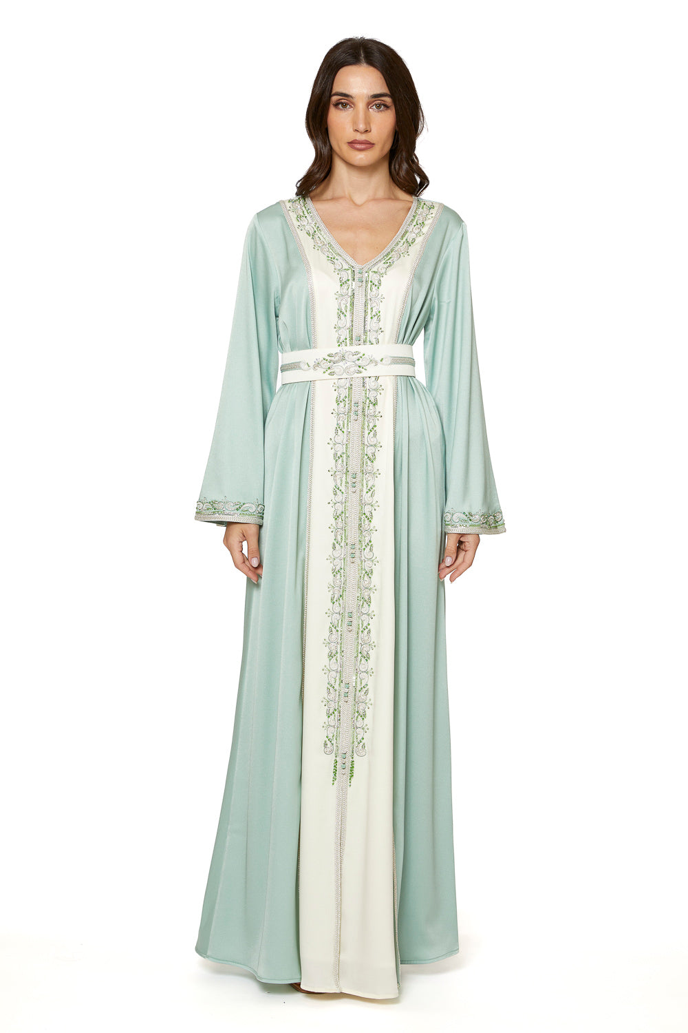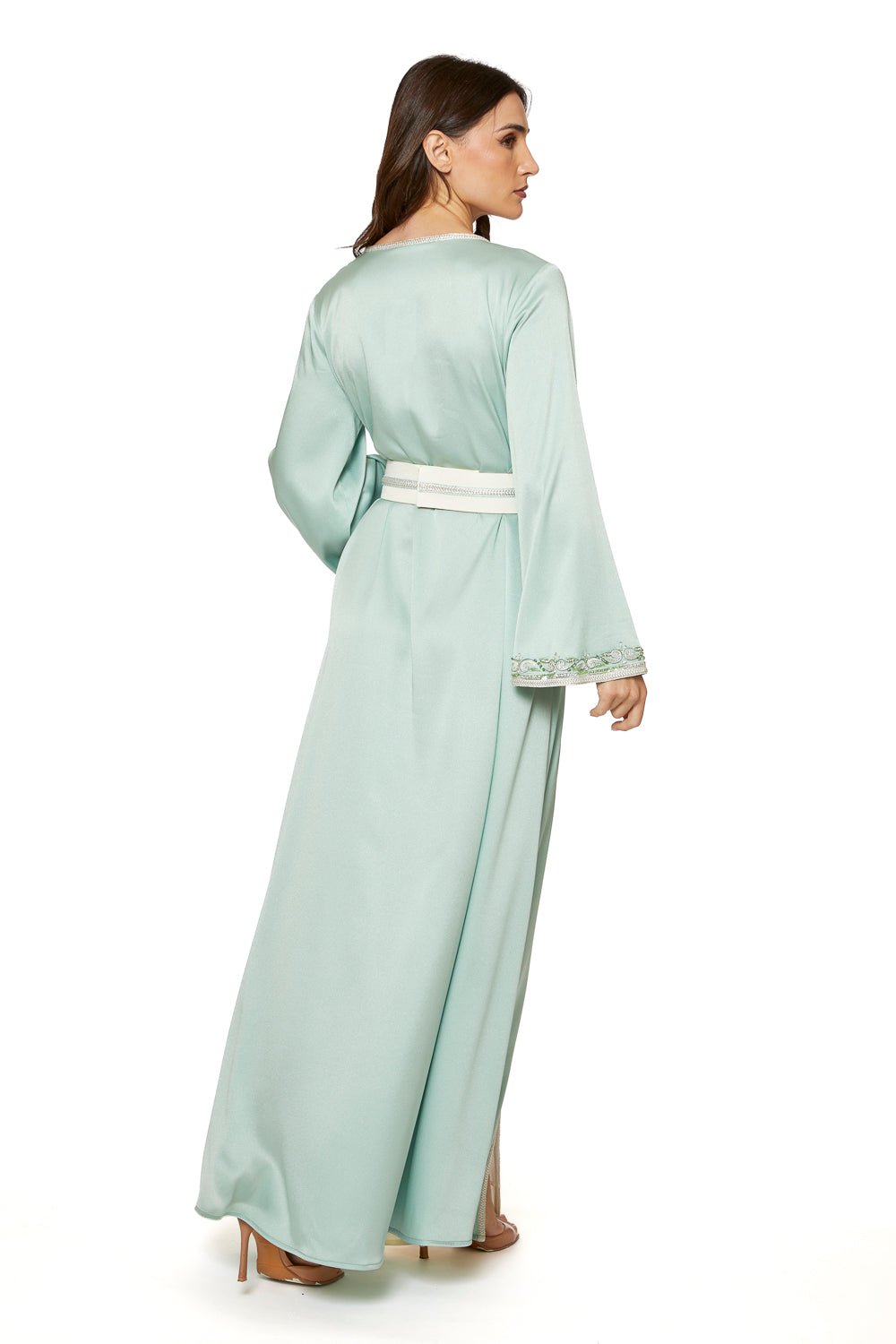 Moroccan Caftan made from silk crepe, rich with a combination of machine embroidery and handmade embroidery